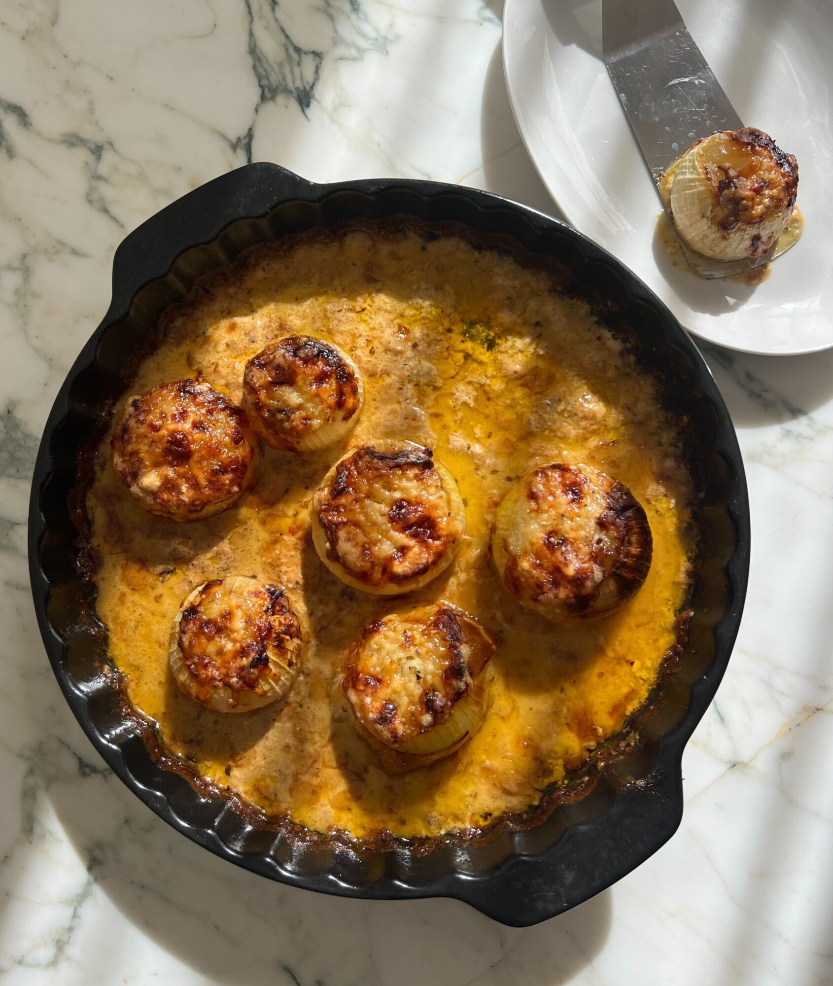 Return to the oven and bake uncovered for a further 25-30 minutes, until the onions are completely tender and the top is golden and bubbling.
